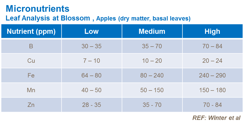 As a consequence of these seasonal variations, sampling is normally carried out at standard times. Traditionally this is at 110-125 days post full bloom, during the middle of the growing season. However, deficiencies may already be restricting growth, yield and quality potential by this stage. Thus, analyses at the blossom stage of growth are increasingly being carried out in order to correct nutrient disorders before they arise.