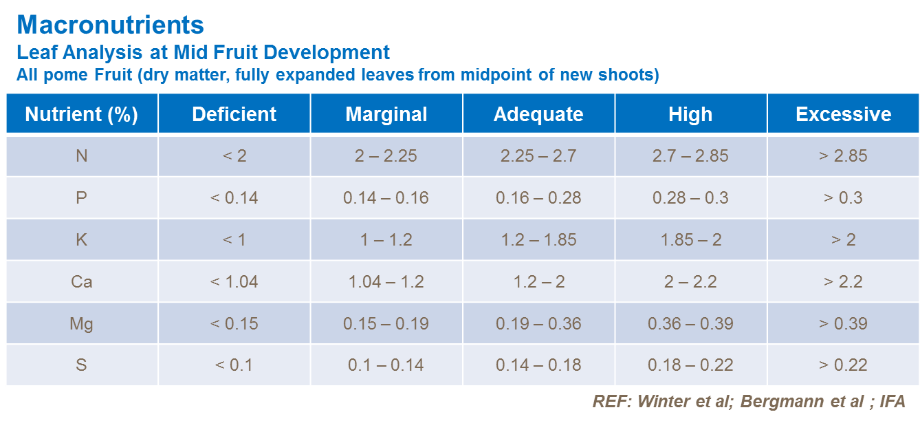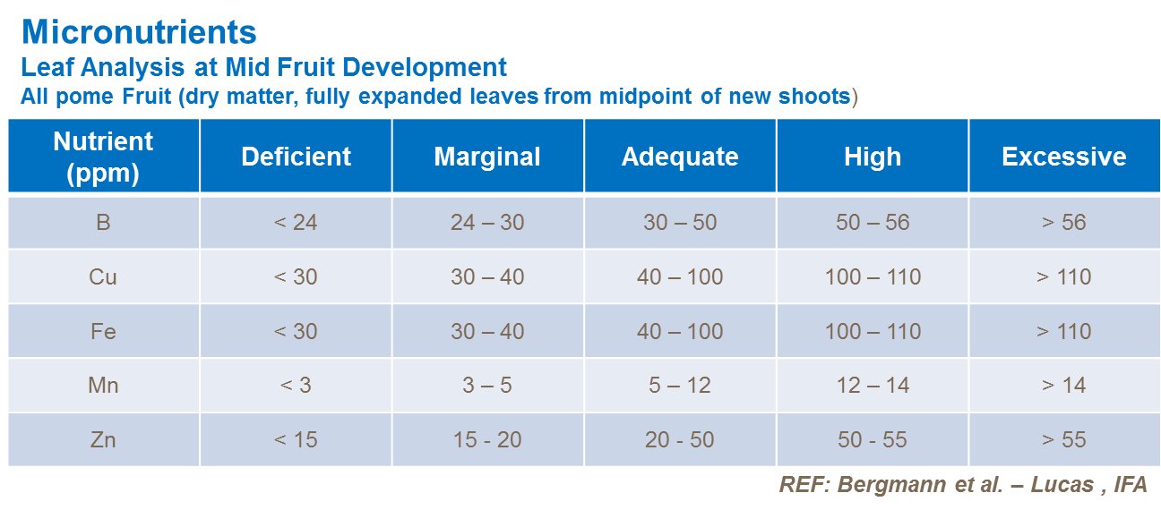 Typical leaf analysis figures for optimum growth for both macro and micronutrients at the post-bloom and blossom stage are given below.