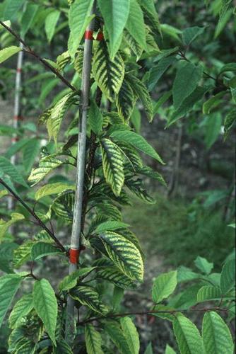 Symptoms occur in the spring and include chlorosis of the youngest shoot leaves, which are stunted and narrower than normal – ‘little leaf’. Leaf margins are ‘wavy’ and may curl. Yellowing occurs between leaf veins. Blind buds and leaf rosetting can also occur. Extreme deficiency results in shoot defoliation and the production of misshapen fruit.